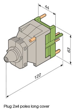 La spina amperometrica FIC-2/4-2 è idonea per il cablaggio di 8 contatti BRE-C.. (2×4). La spina viene fornita con 2 perni per la codifica del connettore, così da evitare errori accidentali di inserimento. La calotta di protezione per l’ingresso dei cavi è di tipo lungo.