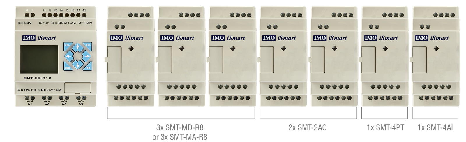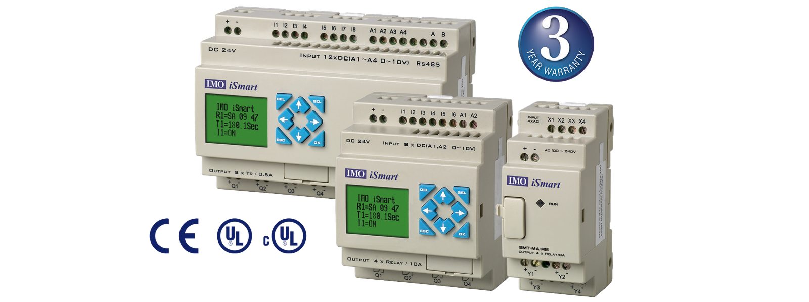 Il relè intelligente iSmart IMO è comunemente impiegato in piccole e medie applicazioni, il relè programmabile iSmart di IMO è un controller altamente conveniente ma flessibile. Offre molte delle funzioni che si trovano in un PLC tradizionale, ed è un controller ideale per applicazioni come imballaggi e distributori automatici, nastri trasportatori, e sistemi di porte automatiche. iSmart è disponibile come modulo base AC o DC con una scelta di opzioni di ingresso e uscita, nonché una selezione di moduli di espansione digitali e relè, incluso il supporto per ingressi e uscite di temperatura, e ingressi e uscite analogici. iSmart viene fornito con un modulo HMI integrato come modulo frontale cieco o opzionale ed è programmato utilizzando il software di configurazione IMO; disponibile gratuitamente ed è completo di uno strumento di simulazione integrato.